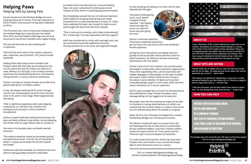 We are proud that Dr. Mohnacky has won the 10News Leadership Award! The Helping Paws Military Appreciation Program would like to thank everyone for their support in receiving this prestigious award! Click here to read the article and watch the news broadcast below: