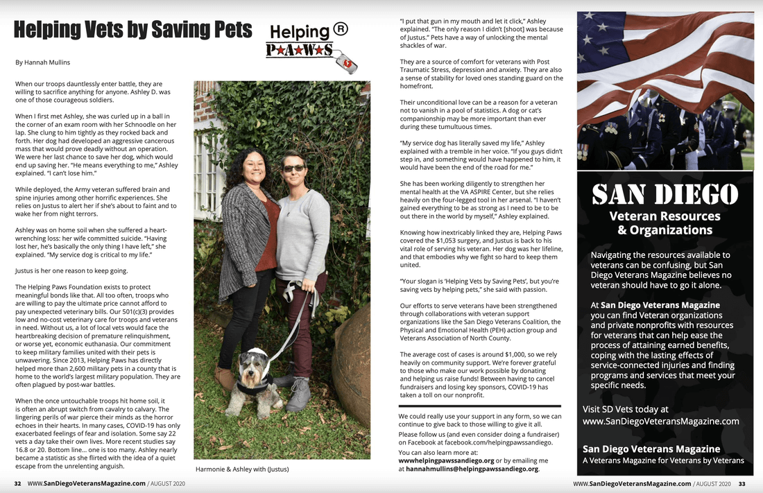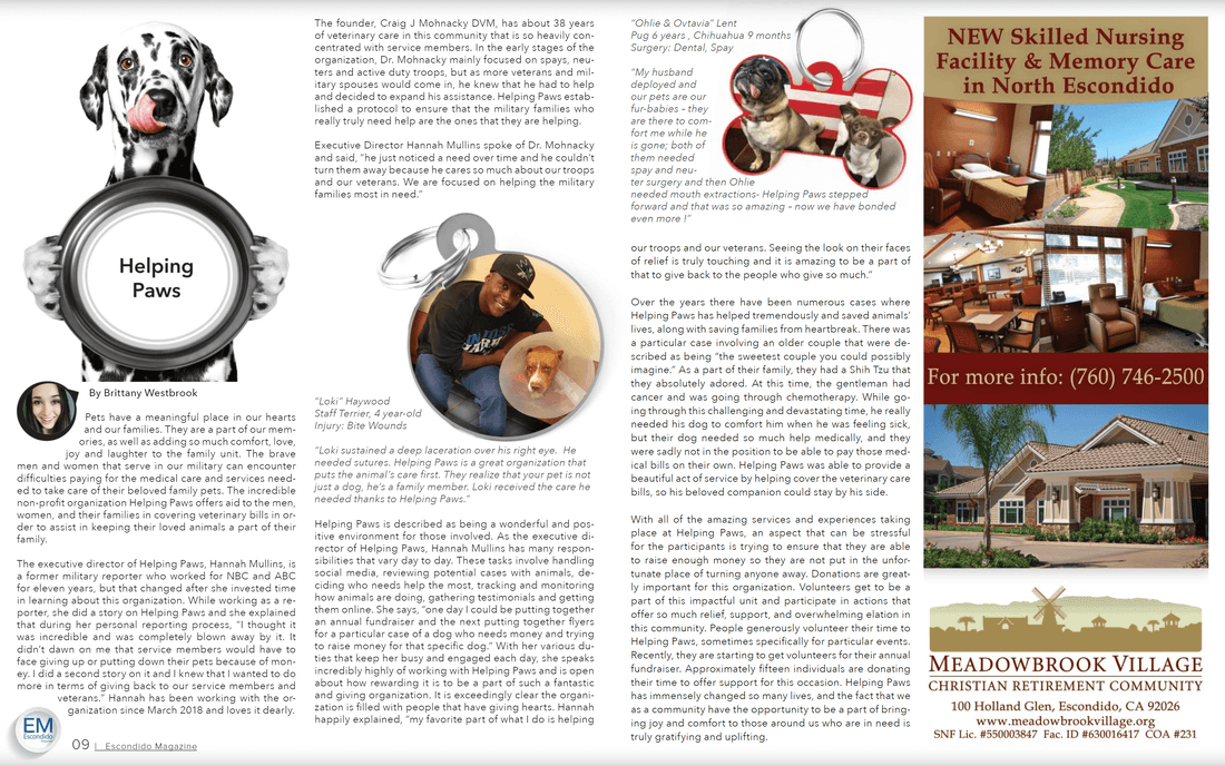 Dinner and a reception was held at the Hilton San Diego Bayfront with 800 community and business leaders in attendance. Dr. Mohnacky’s program, Helping Paws, was highlighted for its contribution to the local military community. Helping Paws was honored to be a part of these great awards program.